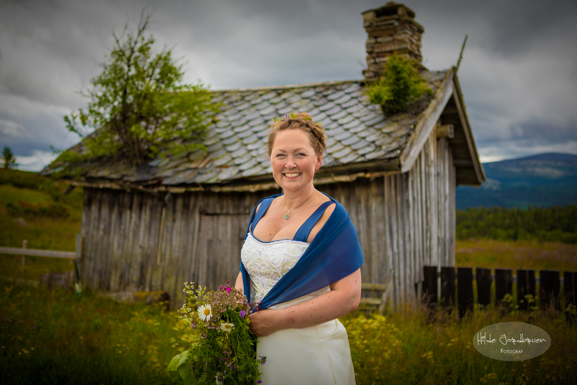 Og dette bildet var det siste vi tok av paret før vi dro hjem. Her er hele den over 200 år gamle setra i bakgrunnen. I tillegg til dette så har vi mange flotte bilder at gjestene og fellesbilde av selskapet, men i samråd med brudeparet har vi valgt å ikke publisere disse da ikke alle mennesker er like glad i å være på bilder og det også er en del barn med på fotografiene - men jeg er helt sikker på at både de og brudeparet kan glede seg over bildene i litt mer private sfærer. Til sammen 110 bilder ble levert fra denne jobben med vielse, portretter og stemningsbilder.